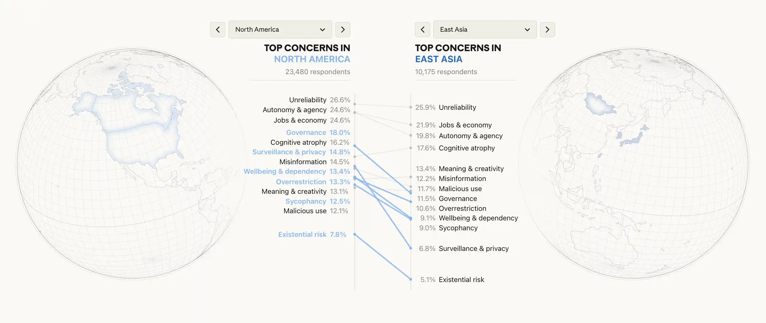 Anthropic publicó los resultados de lo que posiblemente sea el mayor estudio cualitativo jamás realizado, al menos sobre IA. 80.508 usuarios de Claude de 159 países y 70 idiomas hablaron con Anthropic Interviewer, una versión de Claude diseñada para hacer entrevistas conversacionales a escala masiva. No es una encuesta de sí o no. Son entrevistas abiertas, con seguimiento adaptativo. Anthropic usó clasificadores basados en Claude para categorizar cada conversación: qué quiere la gente, qué teme, a qué se dedica, y su sentimiento general hacia la IA. Los gráficos del informe son de los mejores que he visto en un estudio de este tipo 😍.