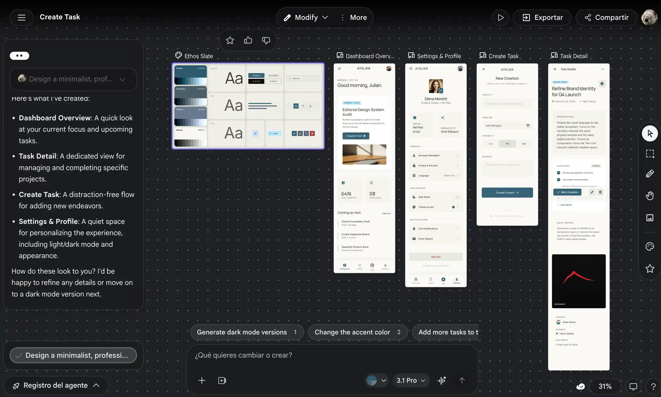Canvas infinito con IA. Ya no es una herramienta lineal. Ahora tiene un espacio donde puedes traer imágenes, texto, código y wireframes como contexto, explorar direcciones diferentes y converger en un solo lugar. Es como si fuera tu zona de diseño pero donde puedes recurrir a Gemini para que te ayude cuando quieras