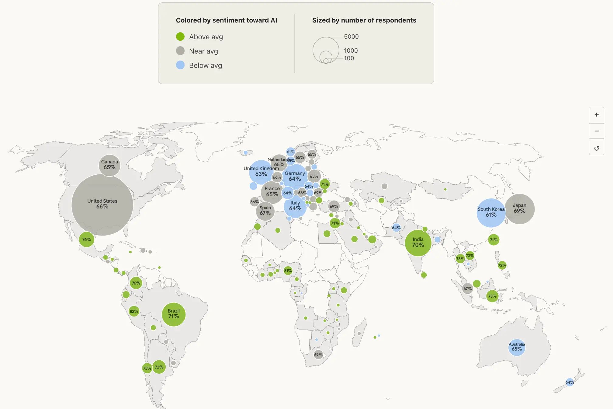 Uno de los resultados: el sentimiento hacia la IA por país. En verde: positivo (por encima de la media), en gris: neutral; en azul: por debajo de la media.